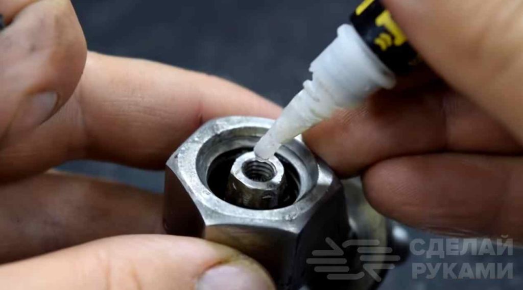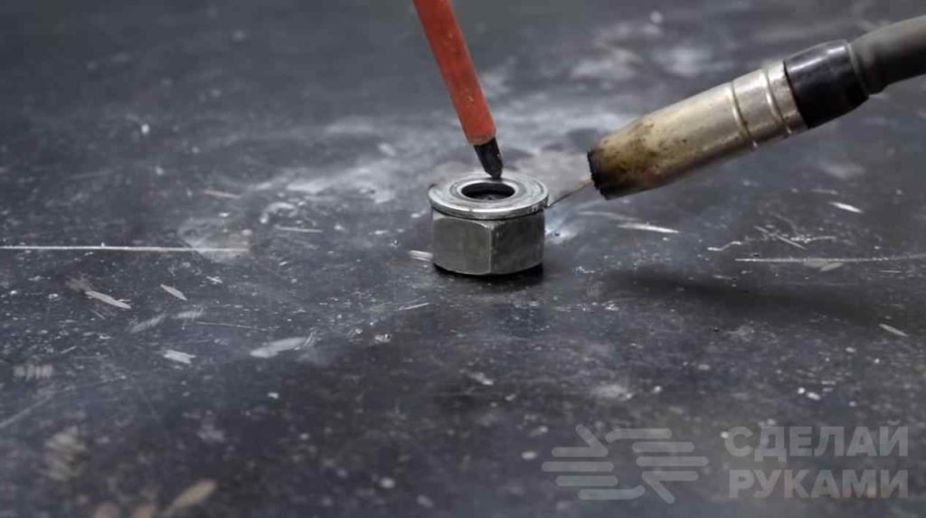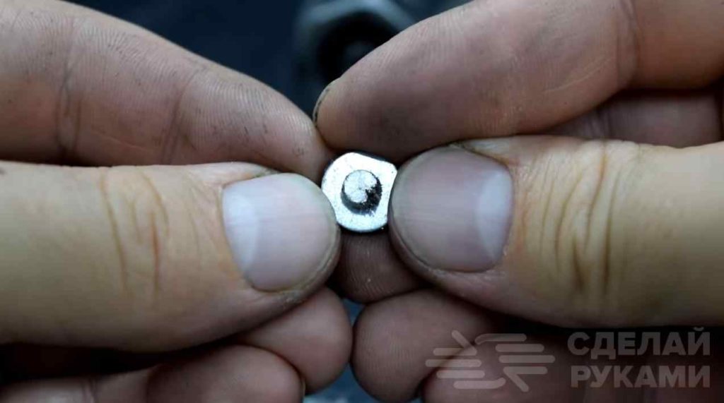 Затем потребуется еще одна гайка и шайба. Свариваем их вместе. Гайку, накрученную на болт, привариваем к шайбе.