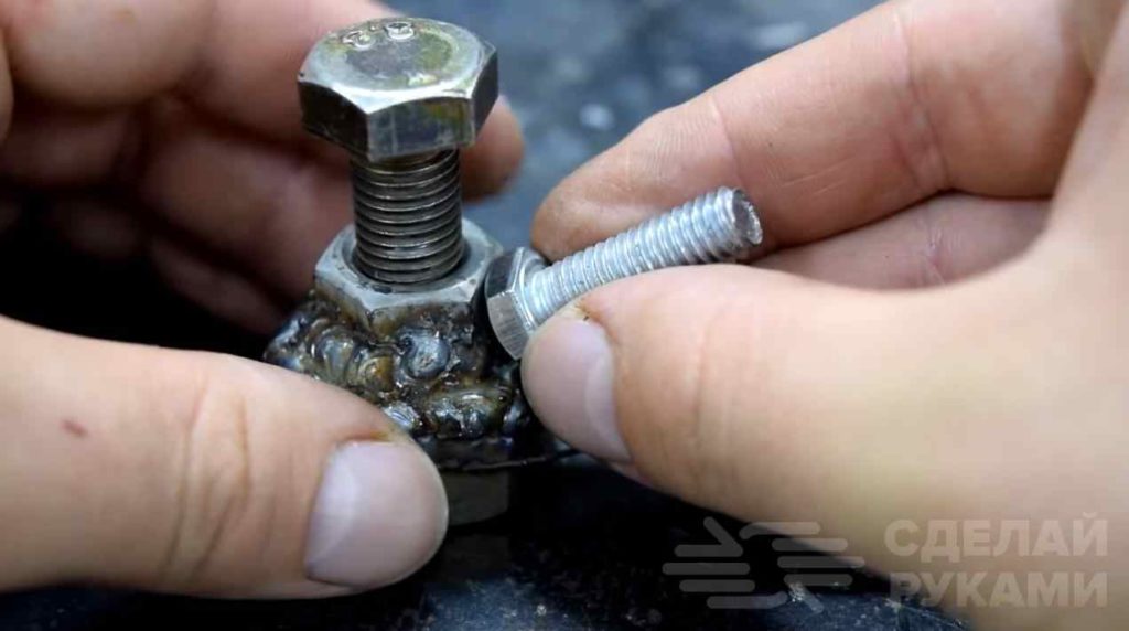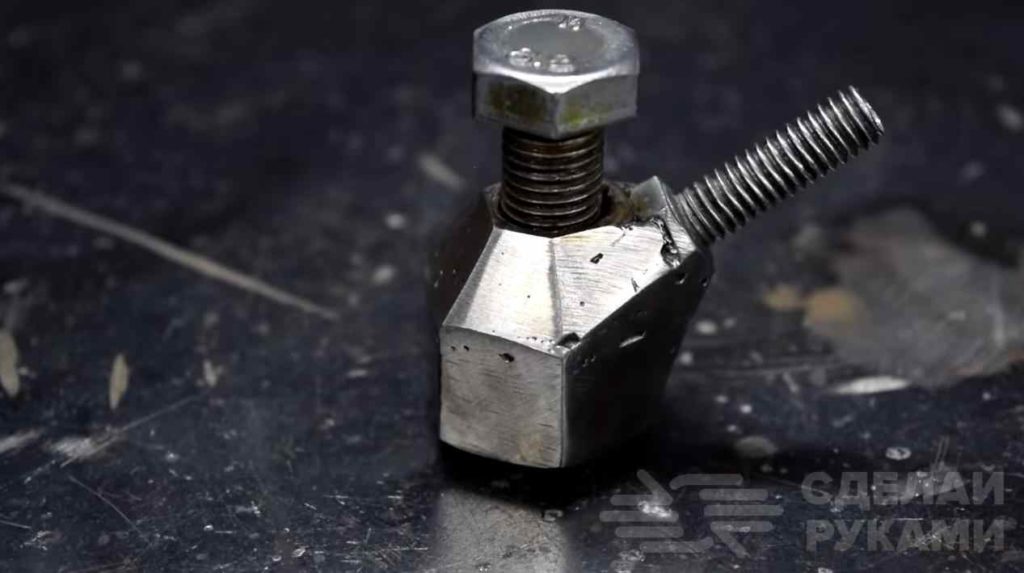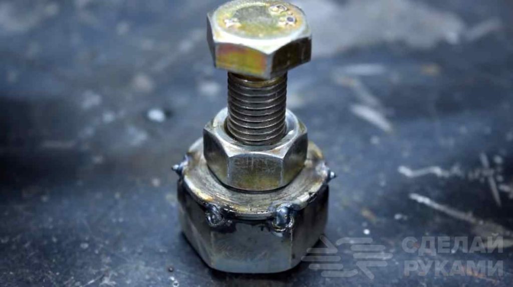 На следующем этапе привариваем сбоку гайки еще один болт. Фиксируем его под углом и привариваем. Затем зачищаем сварные швы.