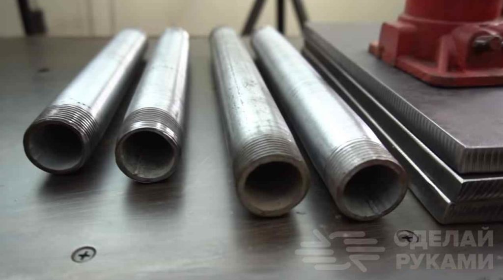 После этого нарезаем резьбу на трубах, и вкручиваем в торцевые крепления две трубы.