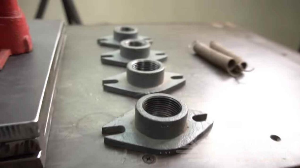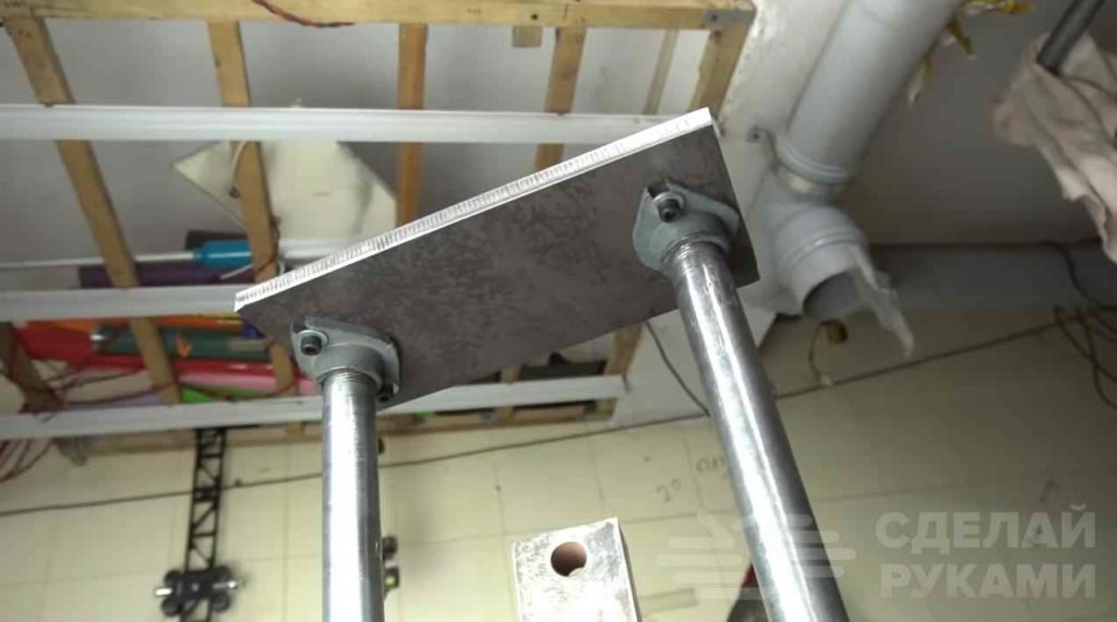 На следующем этапе накручиваем на трубы муфты и вкручиваем в них две оставшиеся трубы. Устанавливаем подвижную площадку. К ее нижней части крепим два уголка. Затем натягиваем пружины.