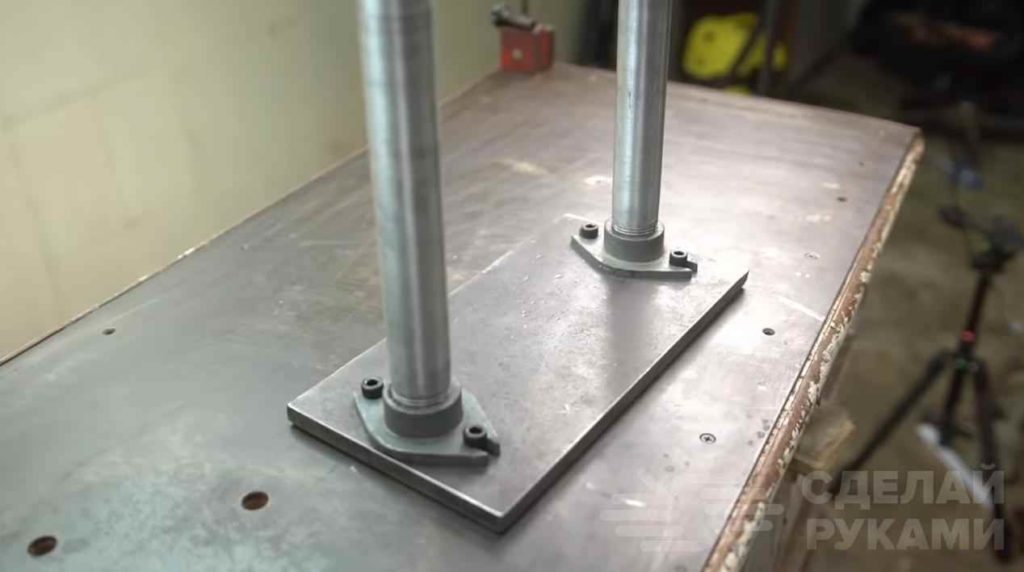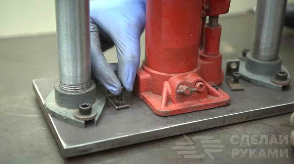 Далее сверлим еще несколько отверстий в основании — крепим гидравлический домкрат и два уголка для пружин.