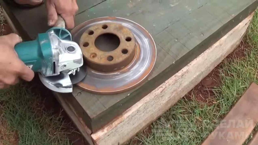 Для начала от тормозного диска отрежем центральную часть с отверстиями для крепления. Нам нужна только нижняя часть. Получившееся кольцо зачищаем от ржавчины и откладываем в сторону.