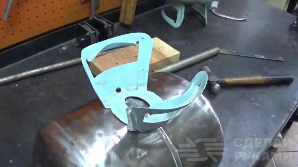 После этого аккуратно отделяем ручки для переноски и приступаем к зачистке всего баллона от краски, после чего делаем разметку. Чуть выше середины баллона проводим линию вдоль всего баллона и разрезаем надвое.