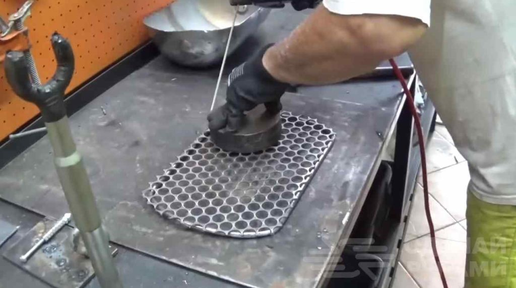 Колосники изготавливаем из одинаковых кусочков арматуры. Свариваем всю конструкцию и устанавливаем внутрь баллона. Между прутками размечаем отверстия для подвода воздуха и отвода пепла.