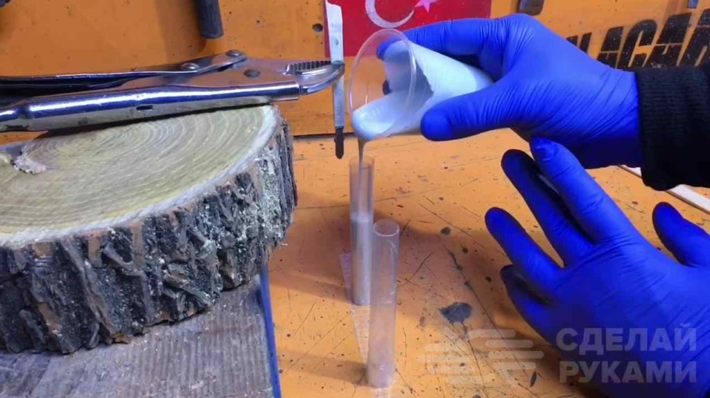 В цилиндры заливаем эпоксидную смолу, и пока она не успела высохнуть, заклеиваем лезвие малярной лентой и устанавливаем его с помощью зажима, отцентрировав над цилиндром со смолой.