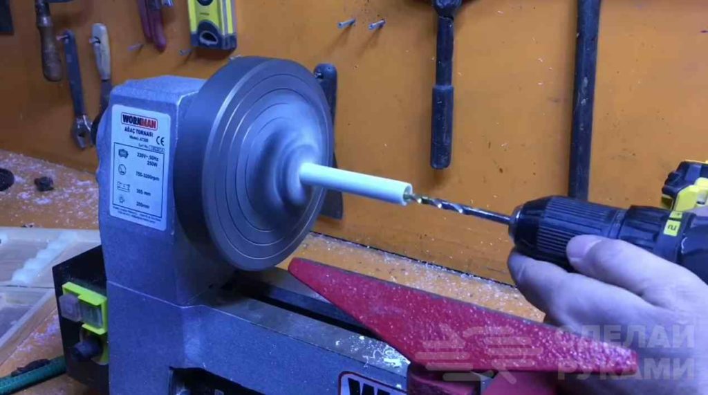 Теперь зажмём в станок вторую часть, которая будет колпачком. При помощи центровочного сверла обозначаем центр нашего колпачка и выбираем всю внутреннюю часть на глубину, равную глубине лезвия плюс на глубину того самого спуска, который мы делали на рукояти.