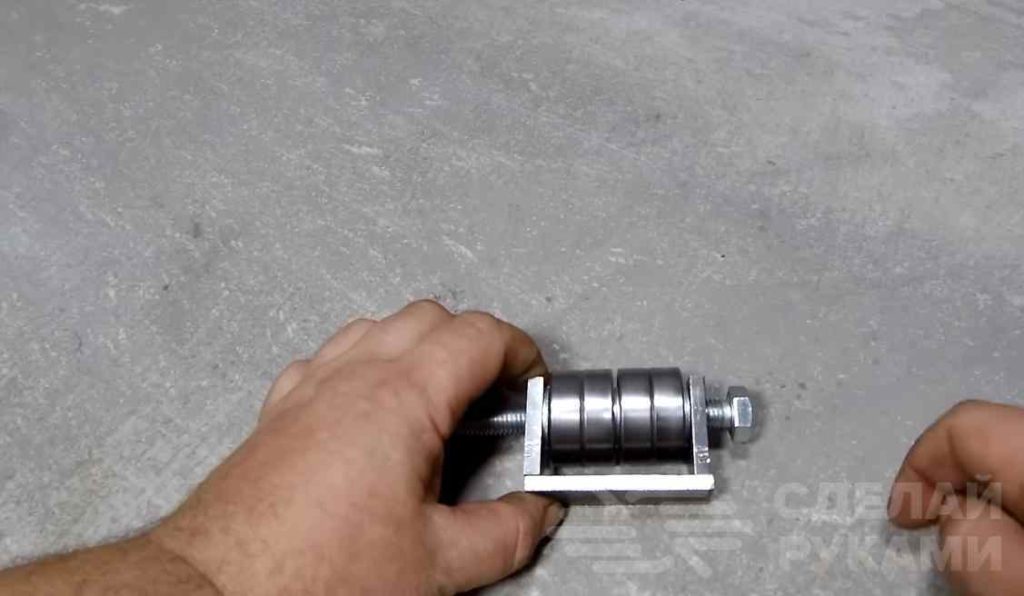 Предварительно автор собирает ось из шпильки и подшипников. Чтобы соблюсти нужную ширину ролика, используем шайбы.