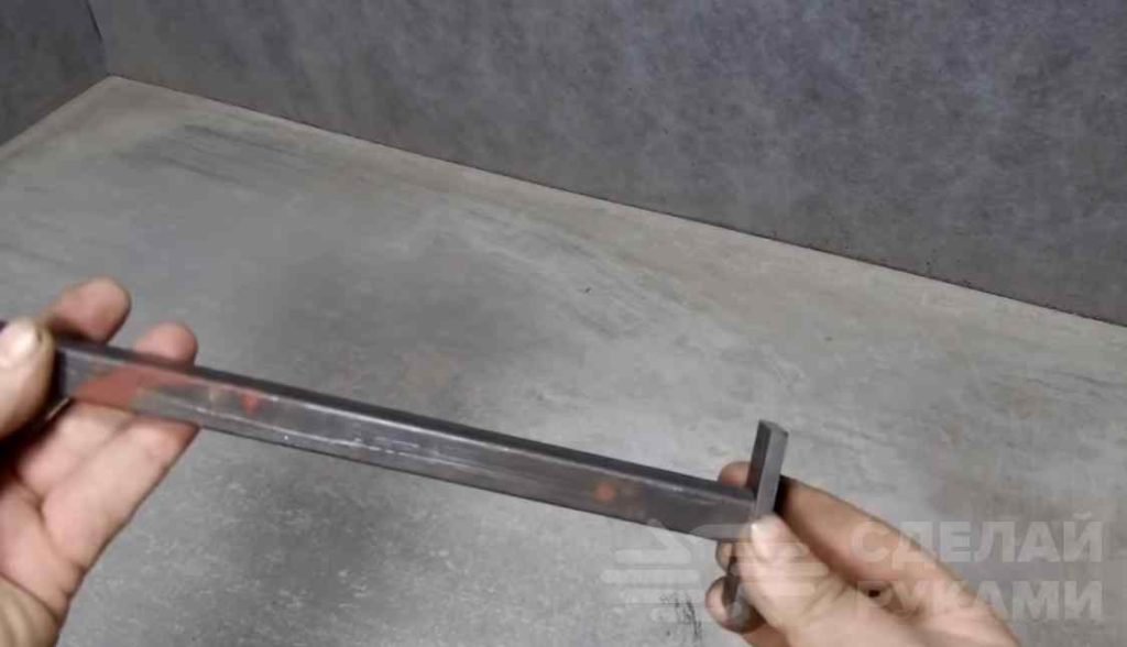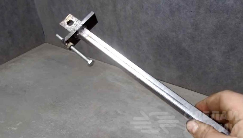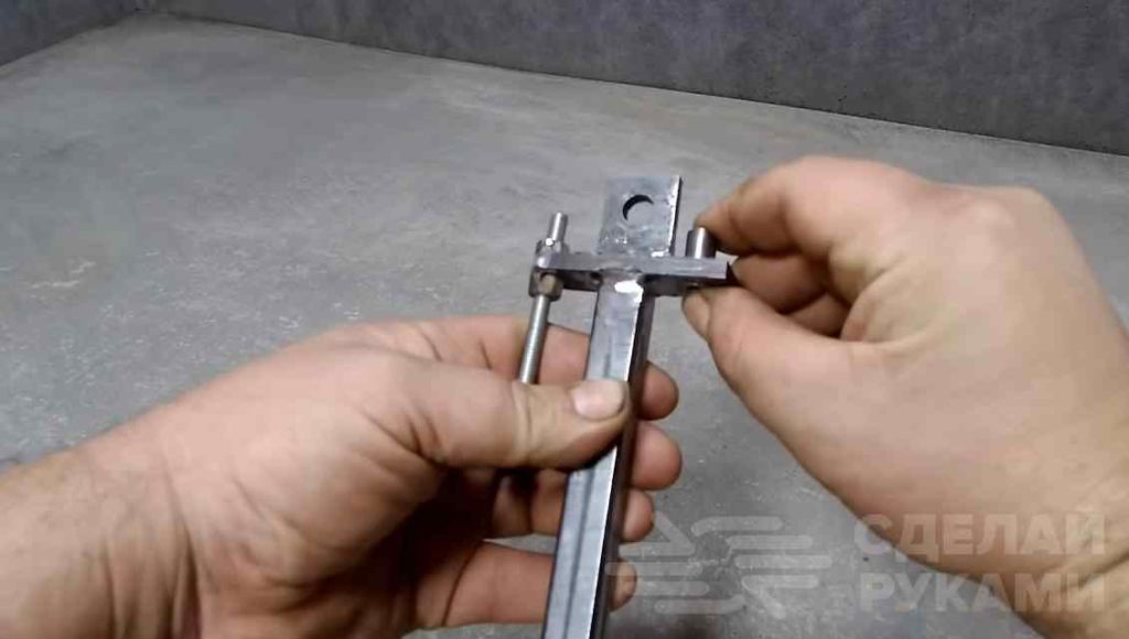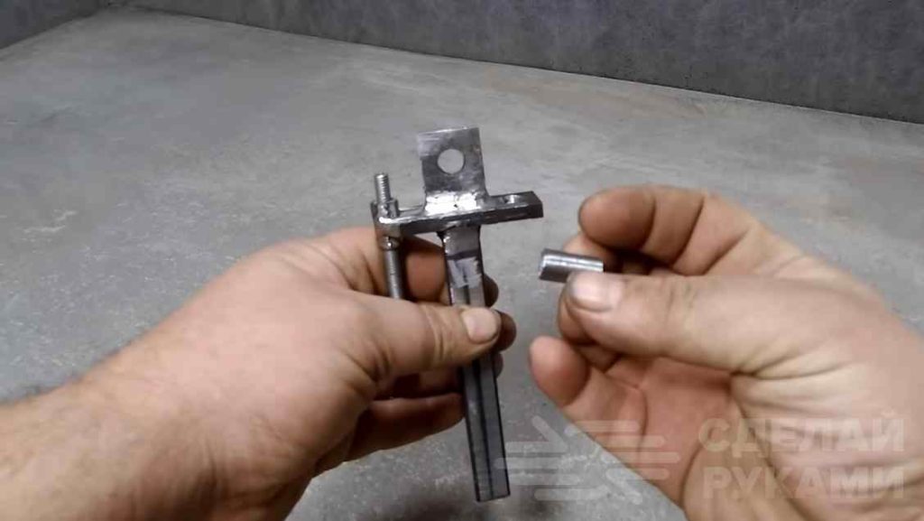 Вторая часть самоделки будет изготовлена из профильной трубы 15х15 мм. К торцу заготовки привариваем перпендикулярно еще один отрезок стальной пластины. В ней делаем выемку под удлиненную гайку.