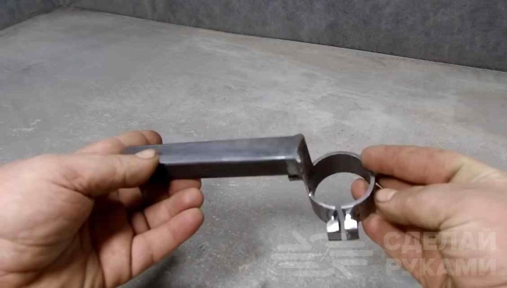 Трубу отрезаем по размеру. Из куска профильной трубы 20*20 мм и отрезка круглой трубы автор делает еще один элемент крепления.