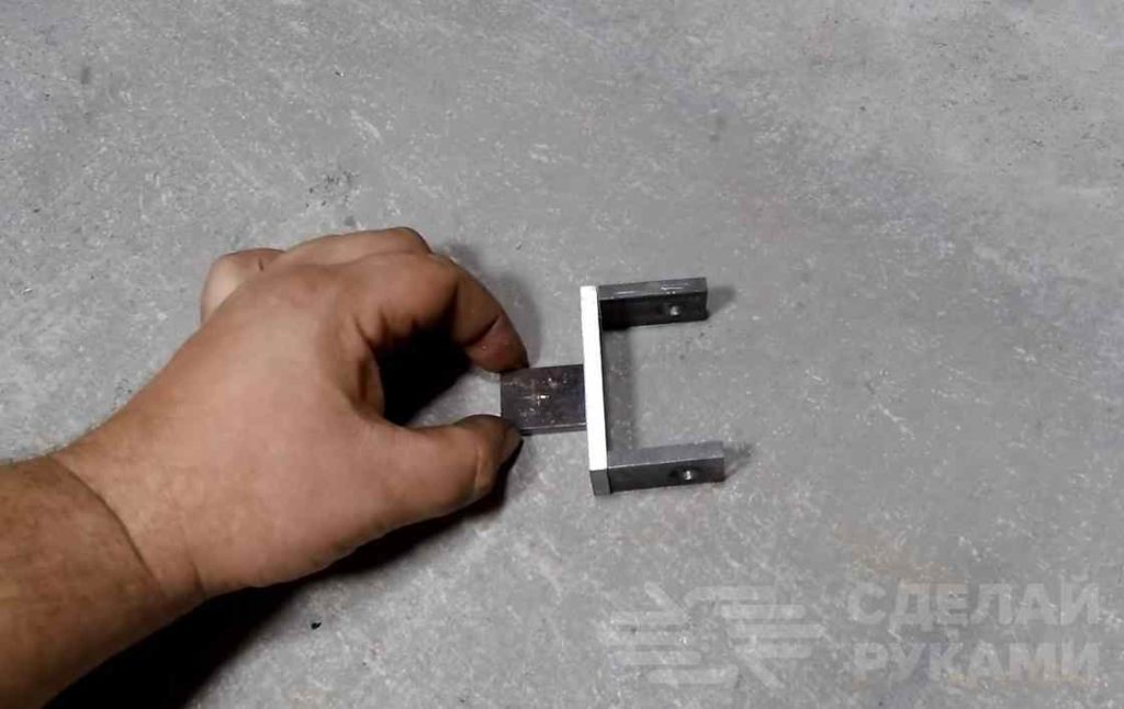 На другой стороне будет располагаться крепление этого узла к основе. Для крепления автор использует два куска металлической полосы толщиной 6 мм. Сверлим в них отверстия, в одном из них нарезаем резьбу.