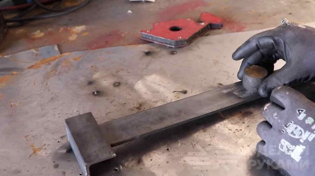 Теперь привариваем по центру полосы металлический кругляк, высотой 20-25 мм. На него навариваем шпильку параллельно полосе.