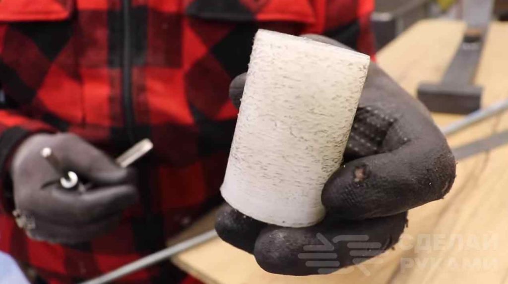 Теперь изготовим ударник. Можно сделать его из кусочка фторопластового бруска. Сверлим неглубокое отверстие и накручиваем на шпильку.