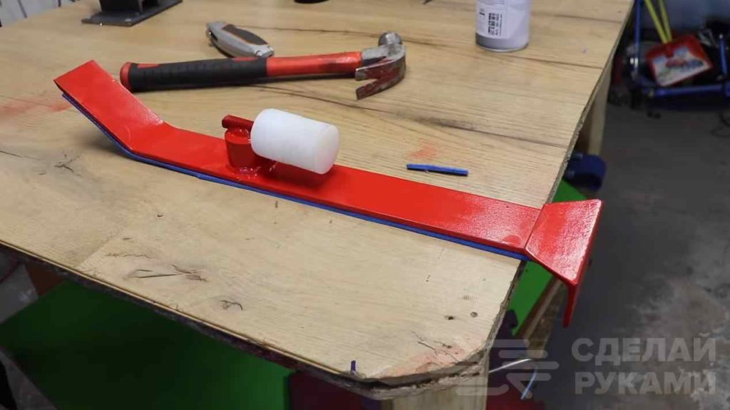 Приклеиваем кусочек каремата на нижнюю часть инструмента. Если всё сделано правильно, то загнутый край инструмента, можно использовать как монтажку, для небольшого поддавливания. А сам ударник — для окончательной подгонки.