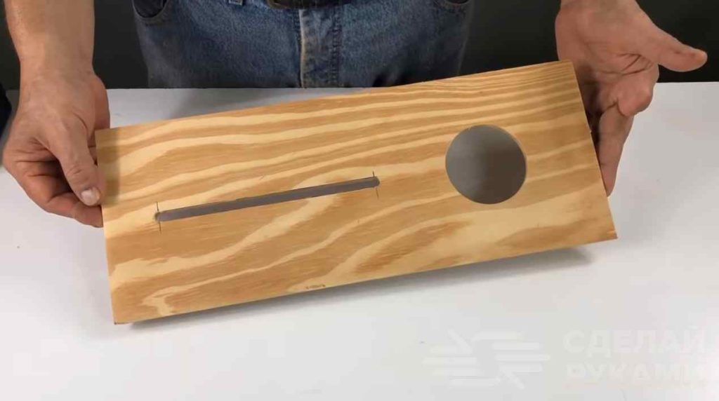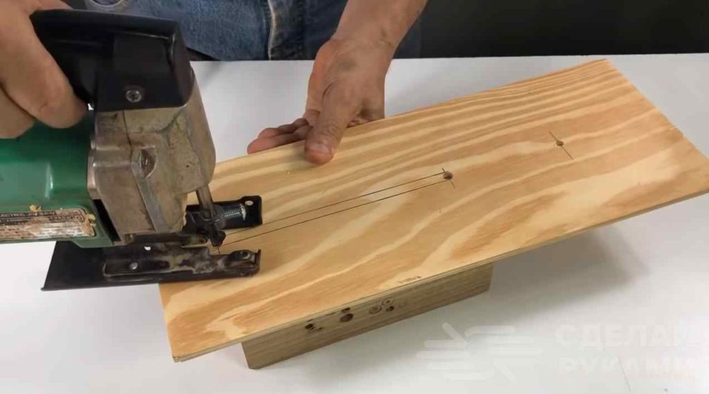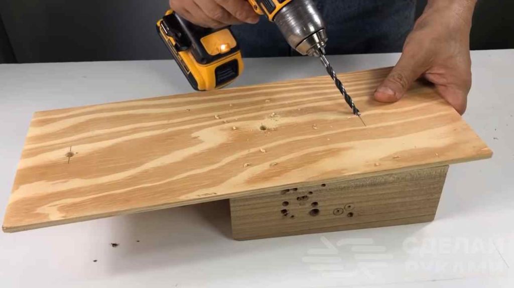 Сначала делаем разметку и при помощи дрели или шуруповерта сверлим в куске фанеры три отверстия параллельно друг другу.