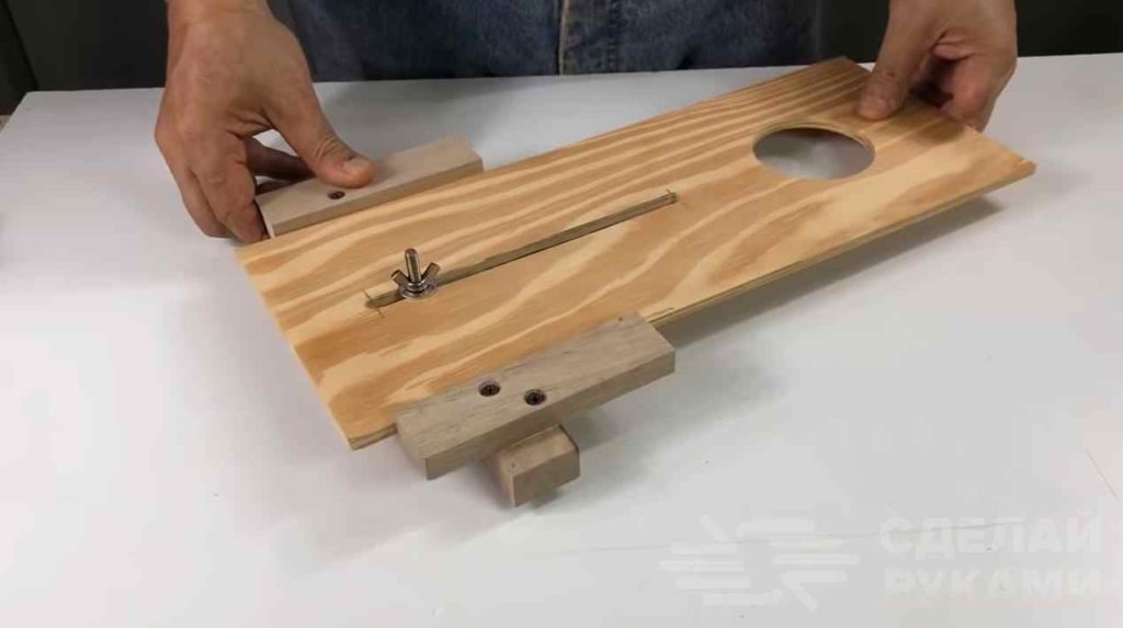 По центру длинного бруска сверлим отверстие и вставляем болт. Крепим брусок к фанере, выставив его под прямым углом. Фиксируем барашковой гайкой.