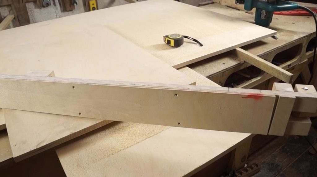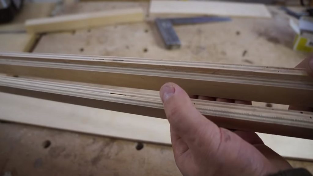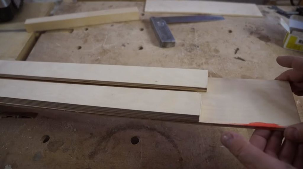 Первым делом необходимо будет отрезать две рейки из фанеры. В них автор выбирает четверть (это можно сделать на циркулярной пиле или с помощью ручного фрезера). После этого приклеиваем обе рейки к основанию из фанеры параллельно друг другу.