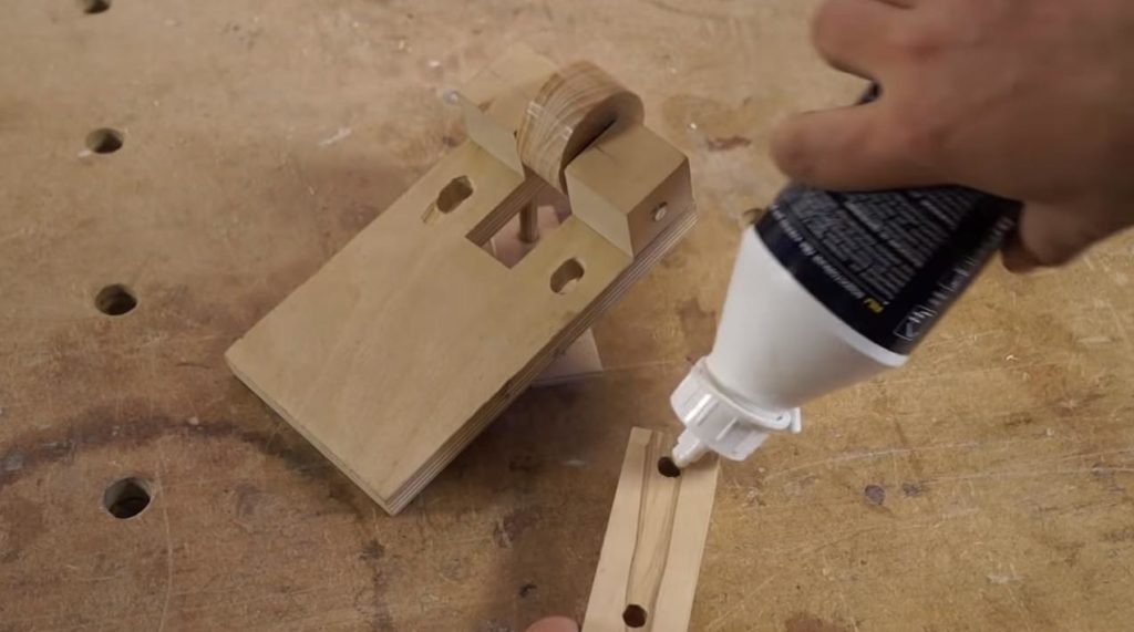 От края основания отступаем 100 мм, и затем приклеиваем две рейки. Оставшийся свободный участок нужен для крепления эксцентрикового зажима. Далее автор изготавливает сам зажим с эксцентриком.