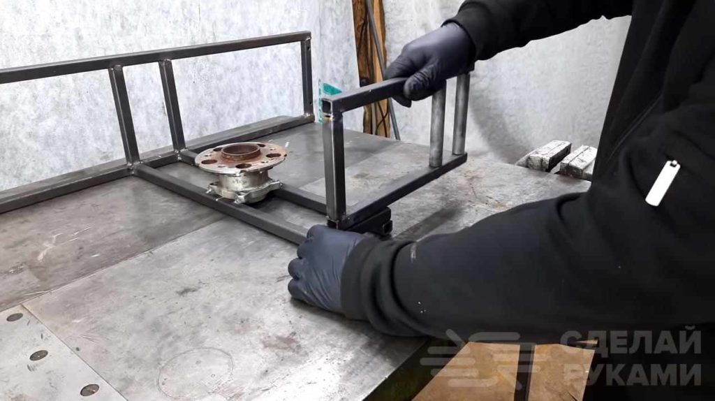Первым делом необходимо будет нарезать заготовки из профильной трубы, из которых будет изготавливаться рама. Привариваем к раме ступицу.