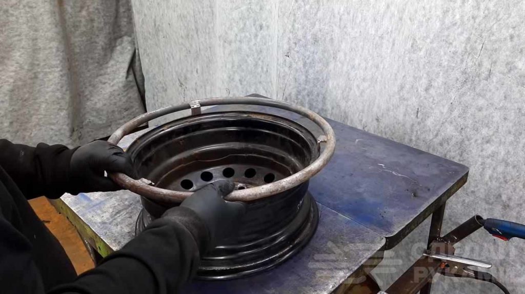 Далее нам потребуется кольцо из круглой трубы подходящего диаметра (можно использовать для этой цели руль автомобиля). Привариваем его к колесному диску.