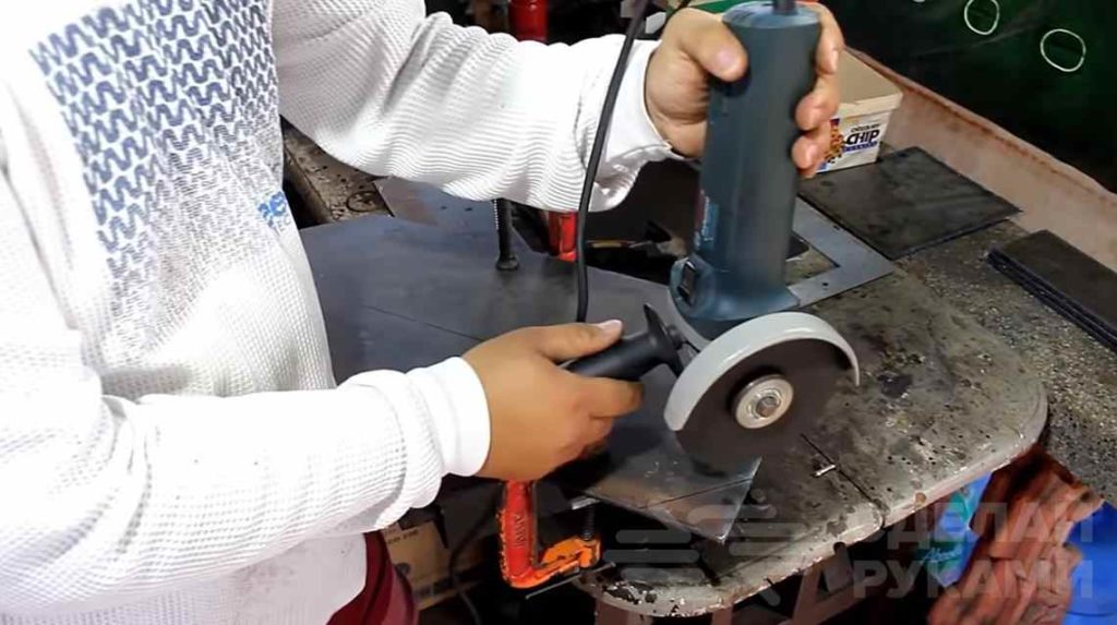 Для начала свариваем всё на прихватки и примеряем домкрат. Провариваем все стыки и зачищаем абразивными кругами. На нижнюю часть установим пластину, она будет играть роль опорной площадки.