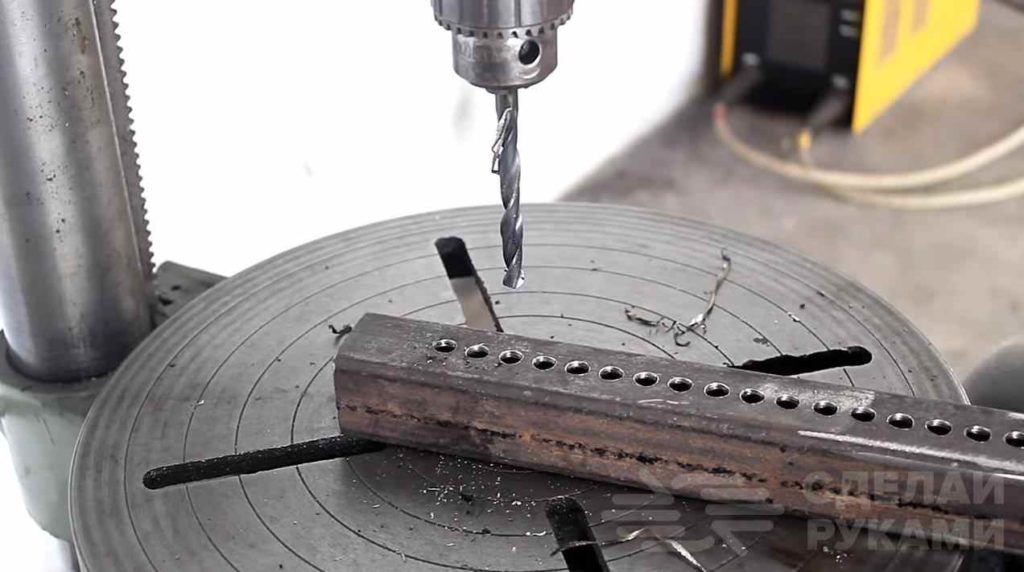После этого по всей длине профильной трубы сверлим отверстия на одинаковом расстоянии друг от друга.