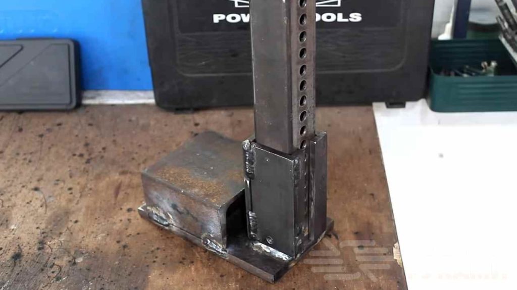 На следующем этапе автор приваривает стойку к основанию из толстой металлической пластины. К основанию необходимо будет приварить отрезок швеллера.
