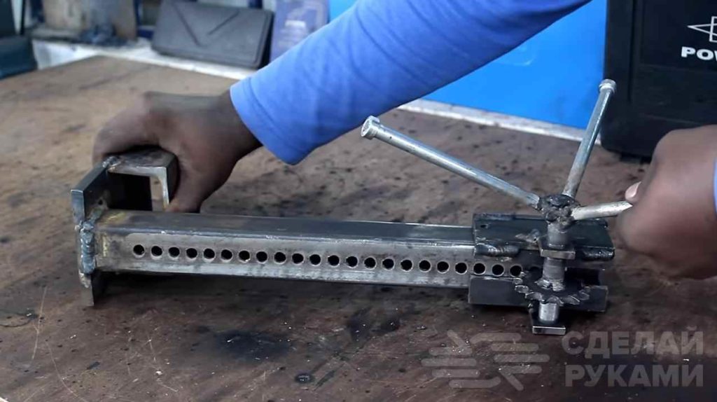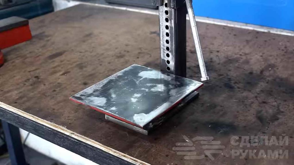 На последнем этапе останется только изготовить крепление для дрели и приварить к швеллеру площадку из металлической пластины (рабочий стол).