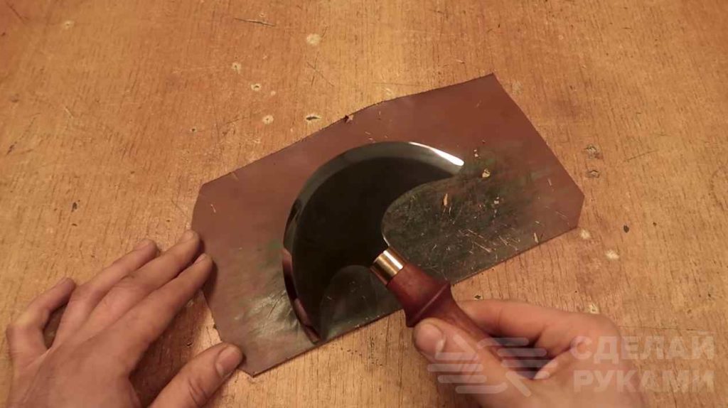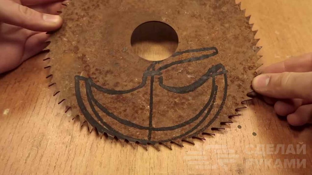 Первым делом, используя бумажный шаблон или просто от руки, рисуем маркером форму будущего ножа — в виде полумесяца. Такой нож называют еще шерфовальным.