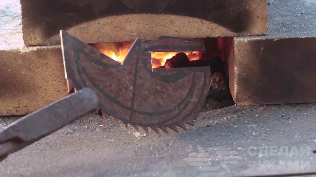 На следующем этапе снова нагреваем нашу заготовку докрасна в горне, но на этот раз, чтобы закалить металл. Охлаждаем в масле. После этого формируем режущую кромку.