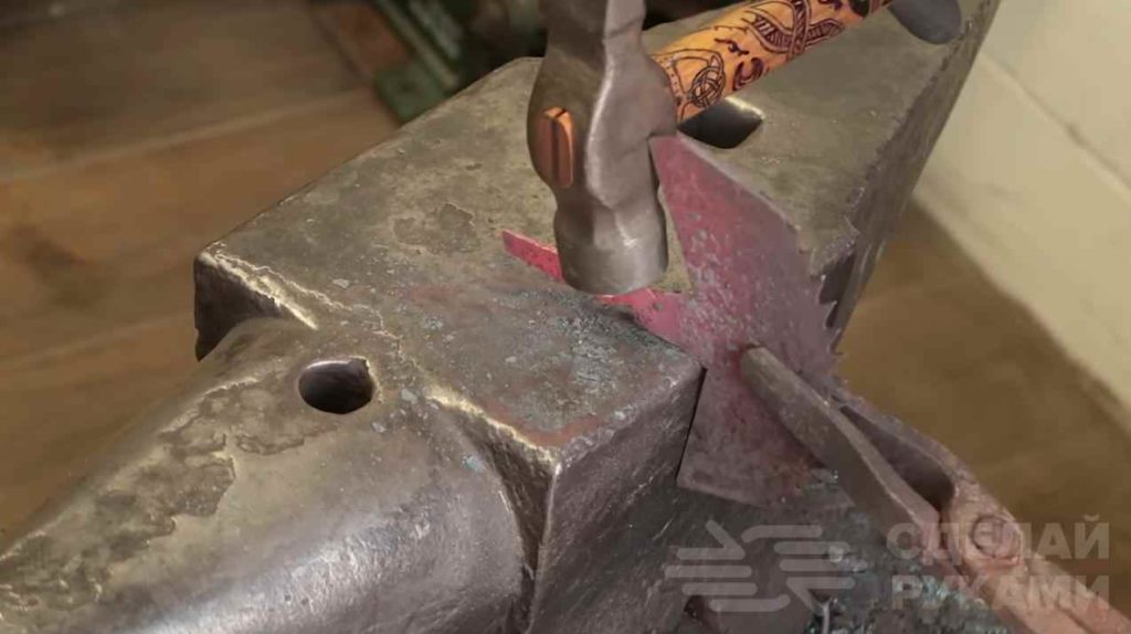 Потом вырезаем заготовку болгаркой. Отправляем ее в горн — разогреваем докрасна и формируем хвостовик.