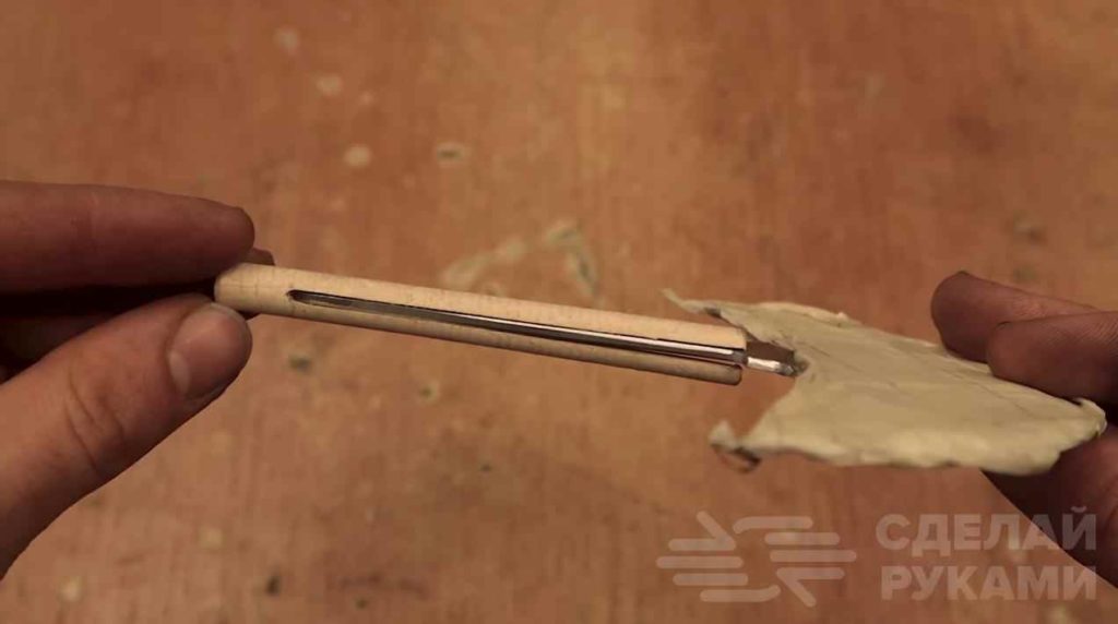 Далее необходимо будет сделать деревянную ручку. На хвостовик ножа нужно надеть круглую палочку, сделав в ней пропил.