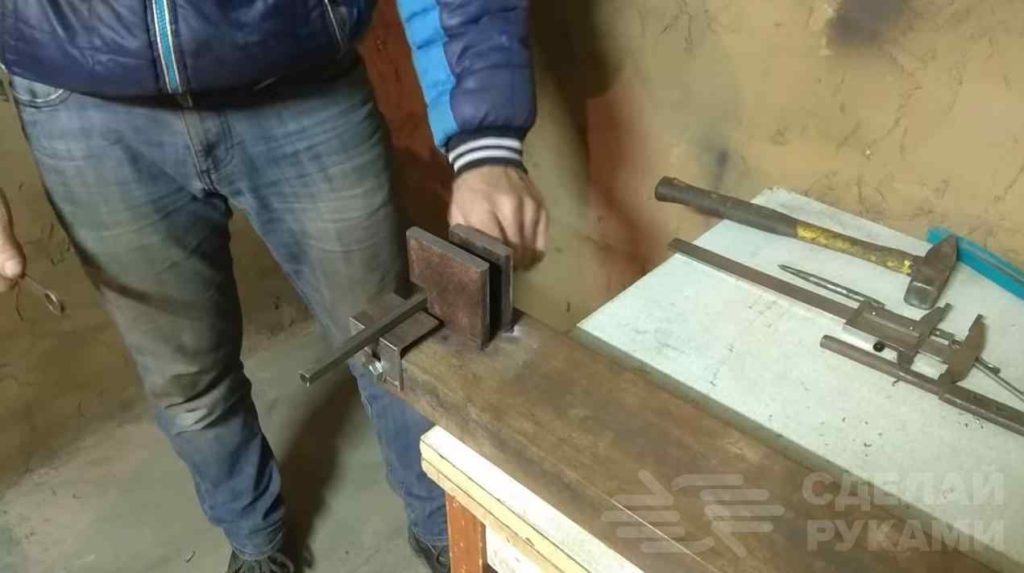 Расстояние между двумя кусками рессоры должно быть таким, чтобы поместился гаечный ключ. Сбоку швеллера мастер прикручивает кусок уголка, который служит в качестве упора для заготовок.