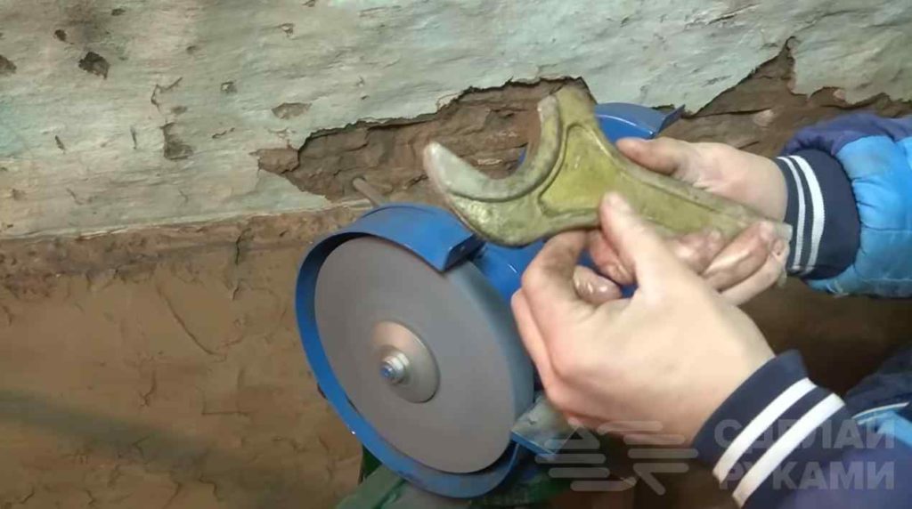 На следующем этапе разрезаем гаечный ключ на две части. Чтобы сделать подвижный нож, нам потребуется только половина ключа. Отрезаем один рожок, второй — затачиваем на наждачном станке.