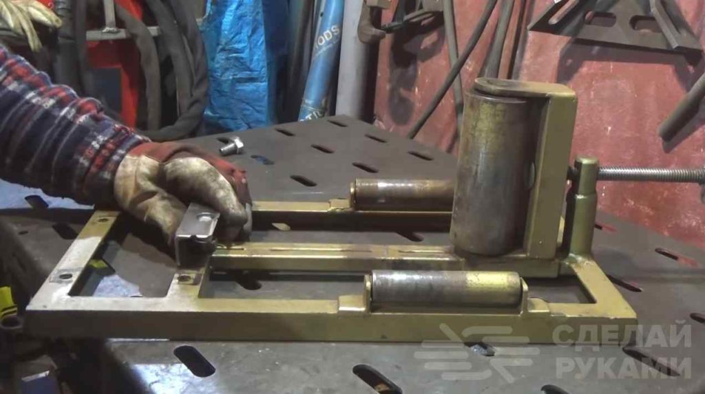 Полозья изготовим из куска швеллера с приваренным швеллером. Он же будет упором для затягивания. Приварим две проушины сверху и снизу швеллера и установим в них необходимый валик.