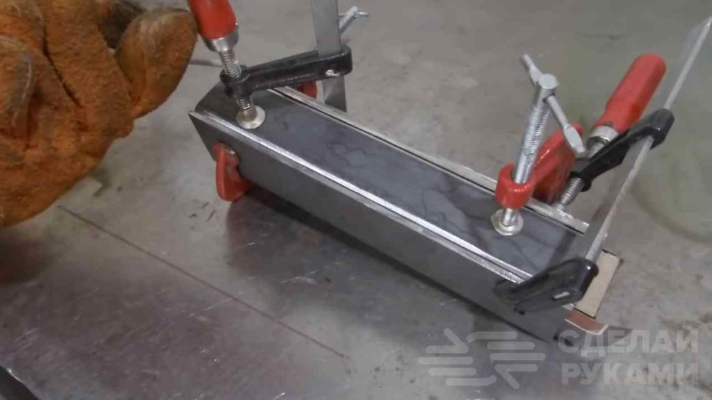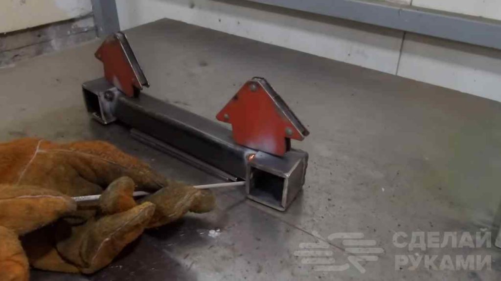 На следующем этапе срезаем края трубки под небольшим углом, чтобы получился небольшой разворот. Собираем импровизированные кубики из кусочков полосы и привариваем их на края квадратной и подрезанной трубки.