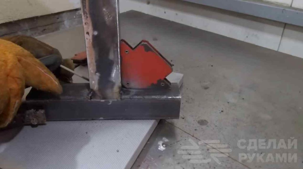 Проводим все те же операции, но уже в меньшем масштабе. Изготавливаем опорные ножки и свариваем всё в виде буквы Т. Для усиления конструкции приварим опорные пластины к ножкам и направляющей.