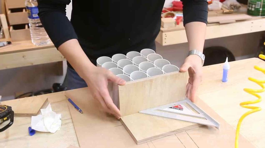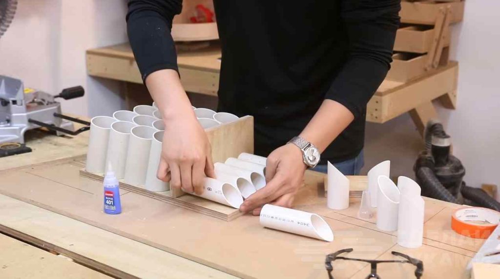 После этого приклеиваем отрезки пластиковой трубы к нашему основанию. Всего мастер использует 16 заготовок. Над верхним рядом крепим полку.