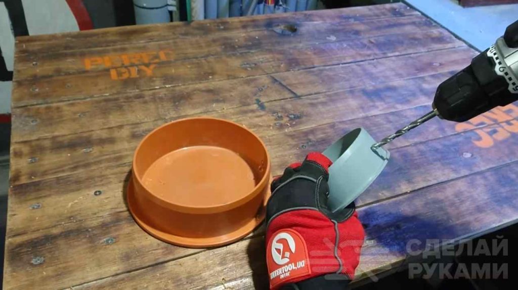 В пластиковых заглушках сверлим отверстия. Из мебельных стяжек делаем ручки для выдвижных полочек.