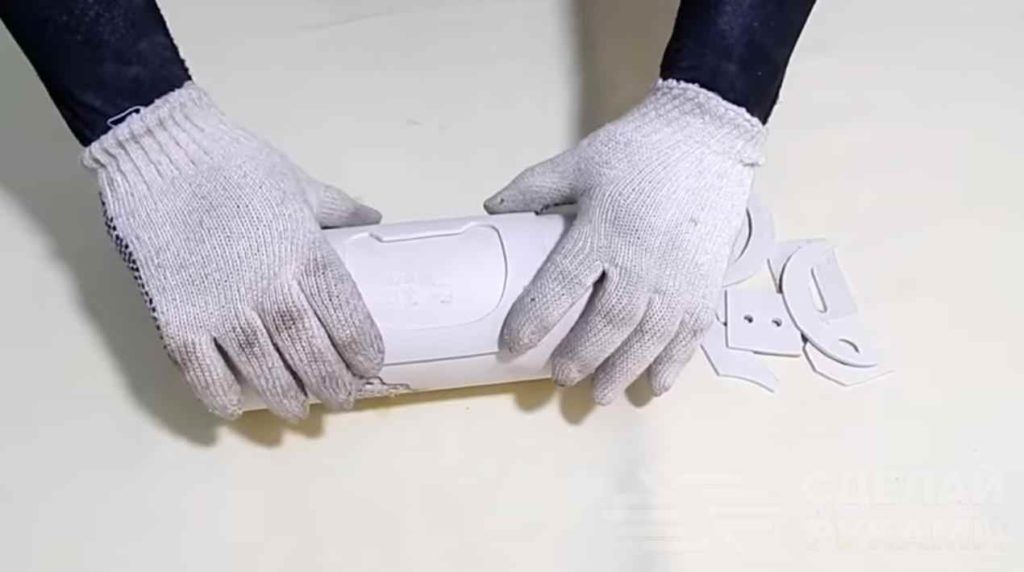 На следующем этапе автор нагревает феном одну из деталей, прикладывает ее к отрезку пластиковой трубы и прижимает на некоторое время, чтобы заготовка приняла необходимую форму.