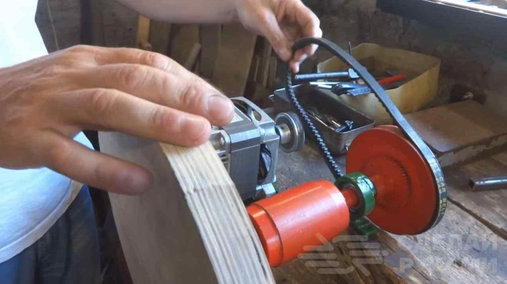 Для ременной передачи нам понадобится двигатель от стиральной машинки (он должен быть в рабочем состоянии). Размещение двигателя может быть как справа, так и слева от рабочего вала — это по желанию.