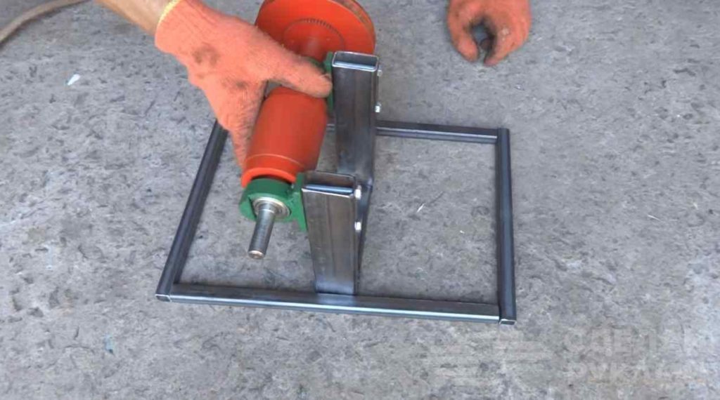 На обратной стороне закрепляем шкив необходимого диаметра. Потом надеваем пару подшипника с гнёздами. Запрессовываем и закрепляем всю конструкцию на основании.