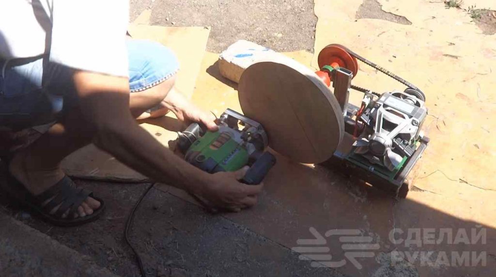 Рабочая площадка для абразивов изготавливается из листа фанеры толщиной 12 мм. Вырезается круглое основание и скрепляется с ведущим валом строго по центру на шурупы и эпоксидный клей. Запускаем наш станок и проводим последнюю полировку площадки.