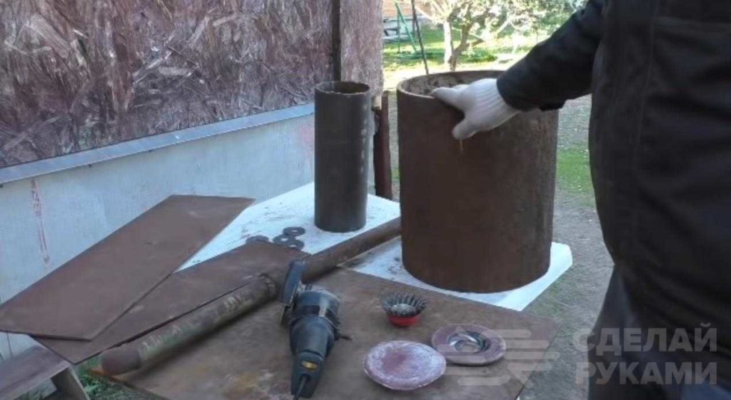 Обратите внимание, что, приобретая на металлоприемке трубу диаметром 325 мм, вы уже покупаете фактически готовую топку. Нужно лишь довести ее до ума при помощи болгарки.