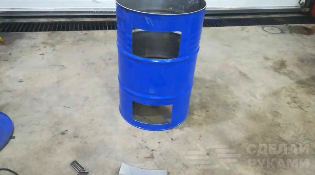 Далее определяемся, где будет дверка топки и дверка зольника. Вырезаем обе дверки и откладываем в сторону.