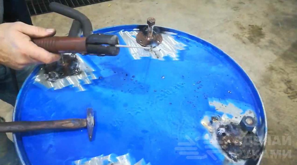 На следующем этапе необходимо приварить к основанию бочки четыре ножки. На небольшие пластинки металла привариваем болты. И далее привариваем их к донышку.