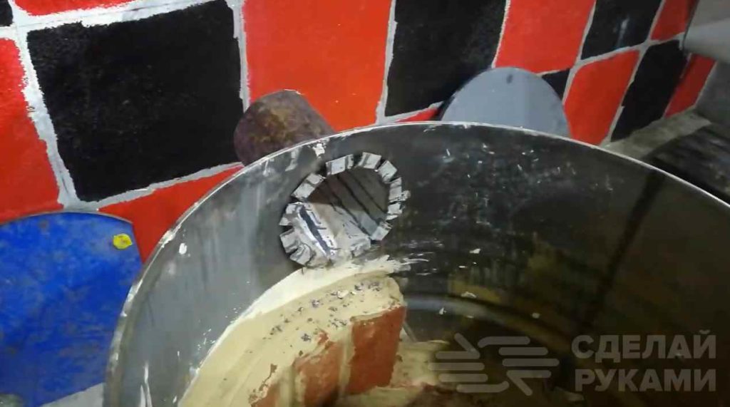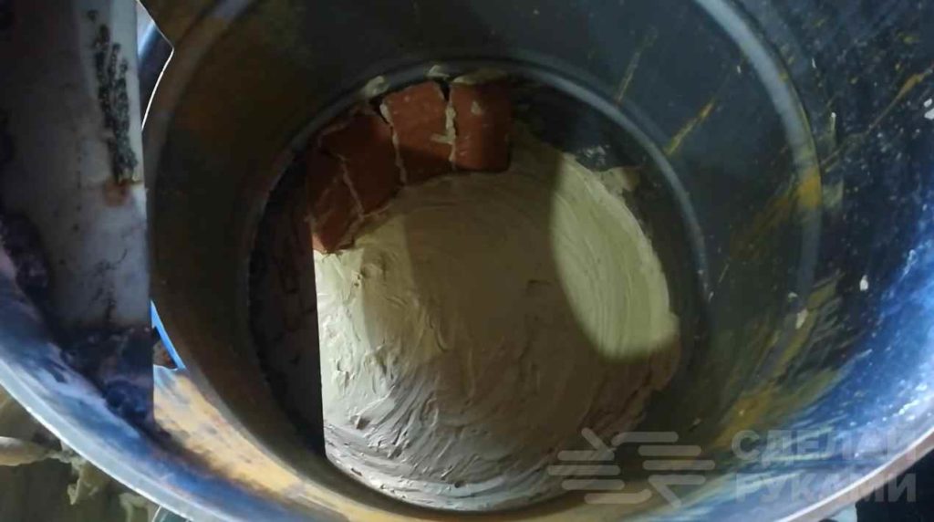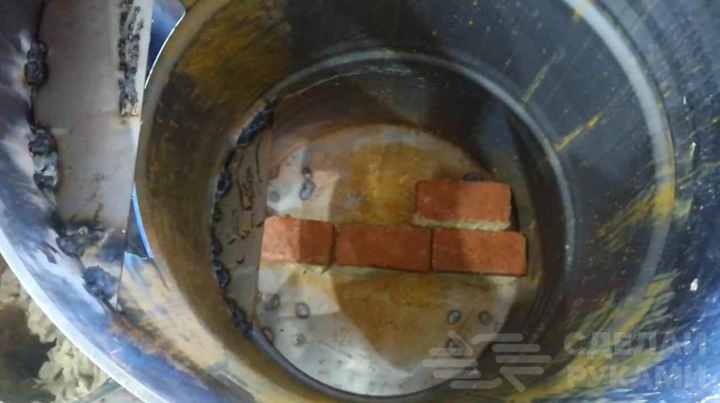 Теперь приступим к укладке кирпича. Выкладываем дно бочки кирпичом на шамотную глину. Далее вертикально вдоль стенок укладываем кирпичи.