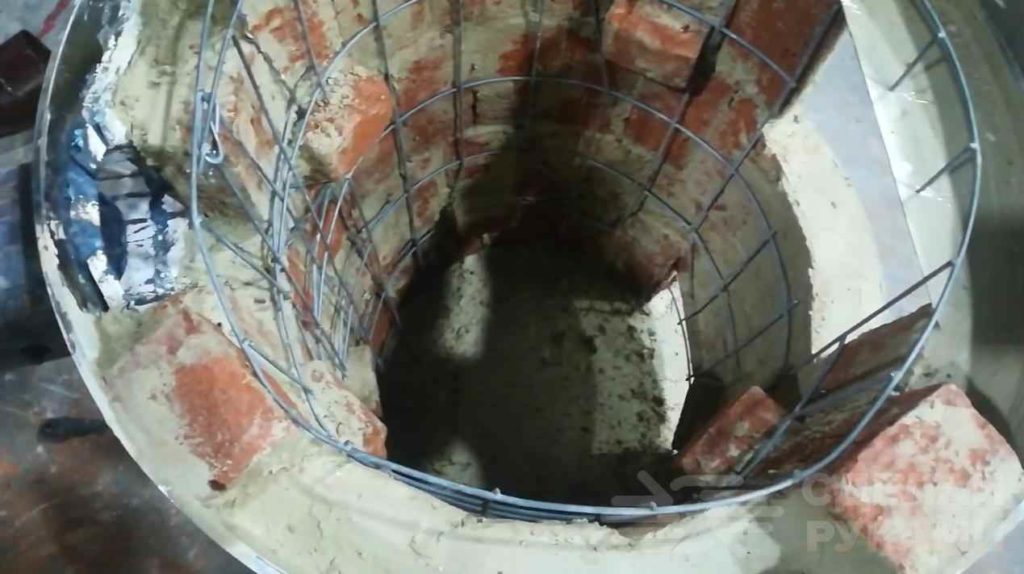 Уложив все кирпичи, замазываем полость печи шамотной глиной. Пока глина подсыхает, изготовим колосник. Сгибаем арматуру внутреннему диаметру полости печи.