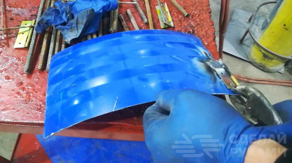 Крепим дверки на своё место при помощи сварки. Крючки для закрывания можно сделать из небольших обрезков плоского металла. Верхняя крышка, она же конфорка, будет изготавливаться из листа стали с небольшим бортиком.
