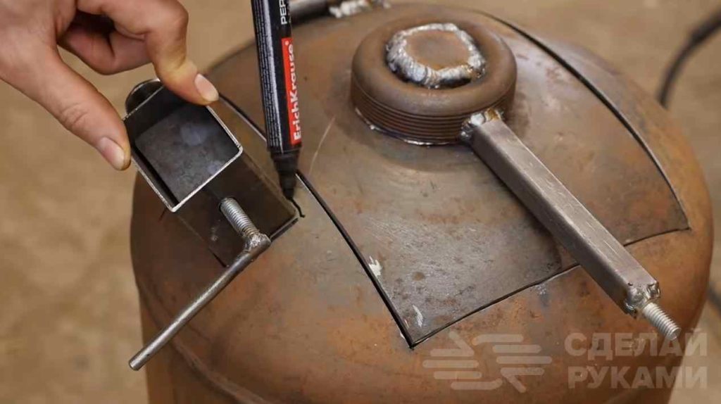 В отверстие будущей дверки (верхняя часть баллона) привариваем пару ограничителей, после чего возвращаем на место вырезанную часть. При помощи металлической петли свариваем воедино баллон и дверку, проверяем работоспособность.