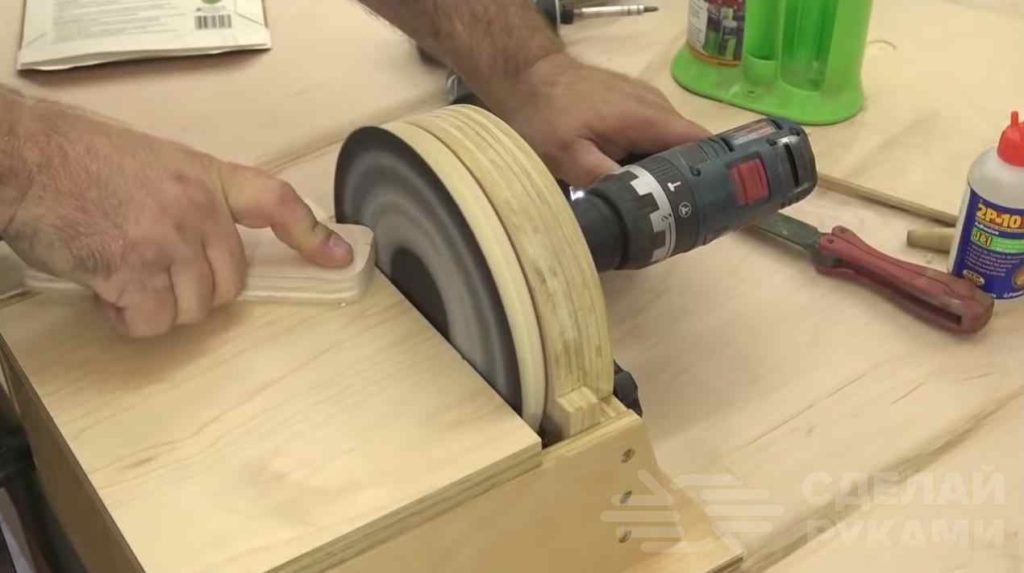 При использовании самодельного шлифстанка в мастерской можно использовать в качестве привода электродрель. Корпус и рабочий стол изготовлены из фанеры.